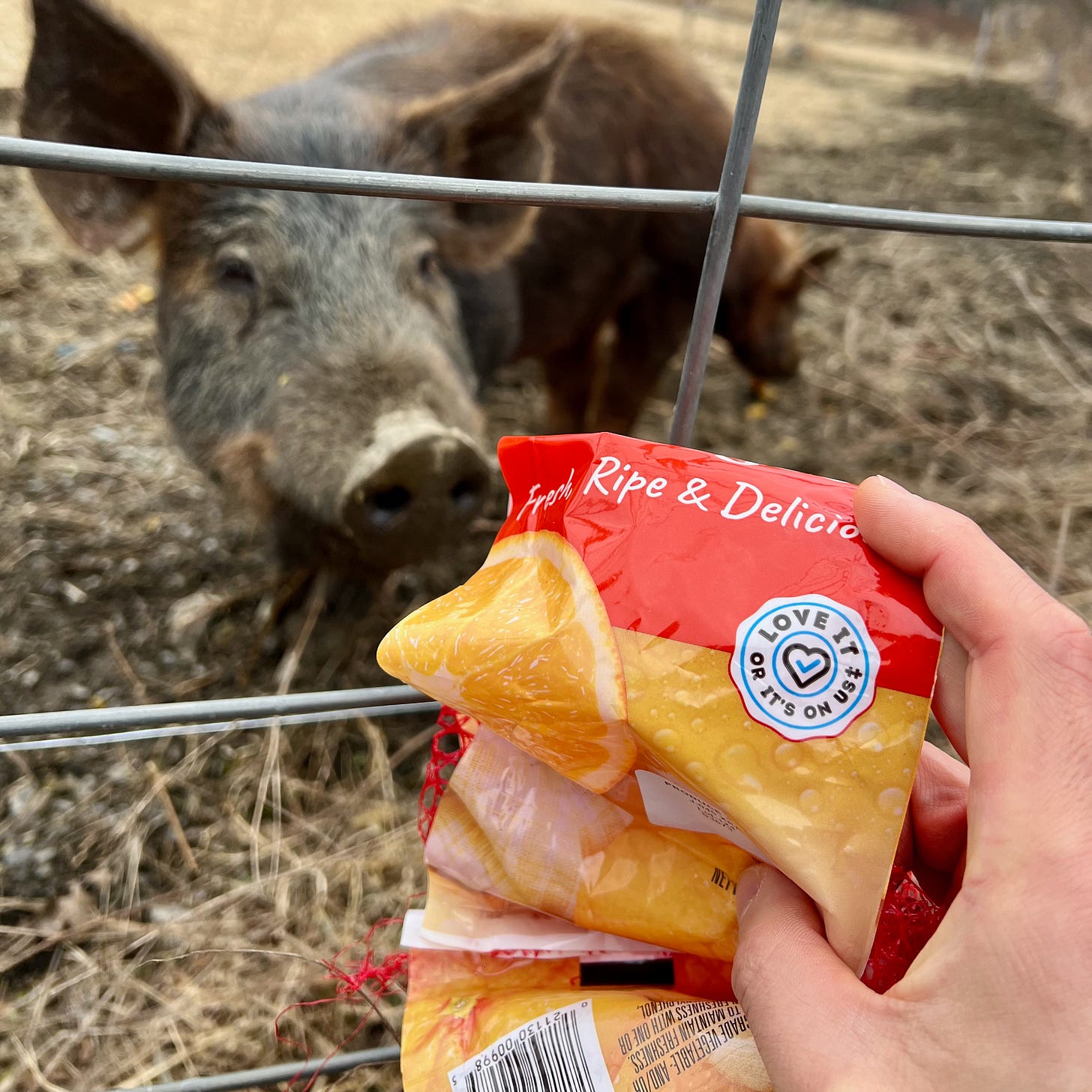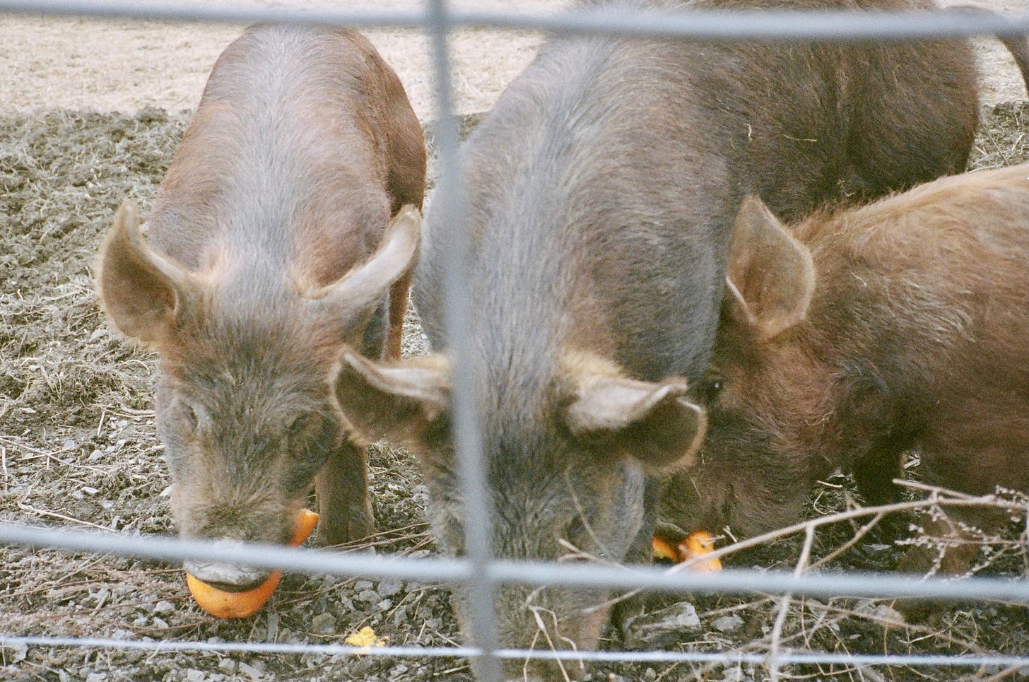 As if on cue, other pigs from all over the field began converging on our location in search of their own citric satisfaction. One pig became four, and then eight. They each took a turn batting their long eyelashes expectantly at us through the fence, pleading for oranges we didn’t have. It wasn’t long before they shifted focus to the mud in front of them. We had nothing to offer, but there could be anything in the mud—even an orange.